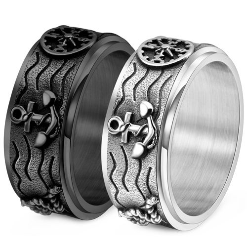 **COI Titanium Black/Silver Anchor & Wave Step Edges Ring-9949BB