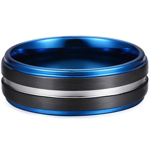 **COI Titanium Black Blue Silver Center Groove Step Edges Ring-7959CC